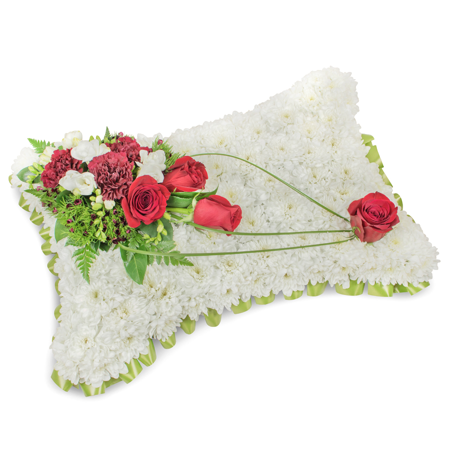Extend your condolences with our stunning sympathy bouquet. Featuring white chrysanthemums, red roses, white freesias, dark red carnations, dianthus, and bear grass, each flower is carefully hand-selected to guarantee freshness and beauty.